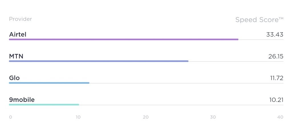 Coming second as fastest network speed in this report is MTN Nigeria. The yellow network recorded a speed score rating of 18.70, 25.87 and 26.15 for the first, second and third quarters, respectively. Other telecom brands in the Nigerian market, Glo and 9mobile recorded speed score ratings as low as 11.72 and 10.21 respectively.