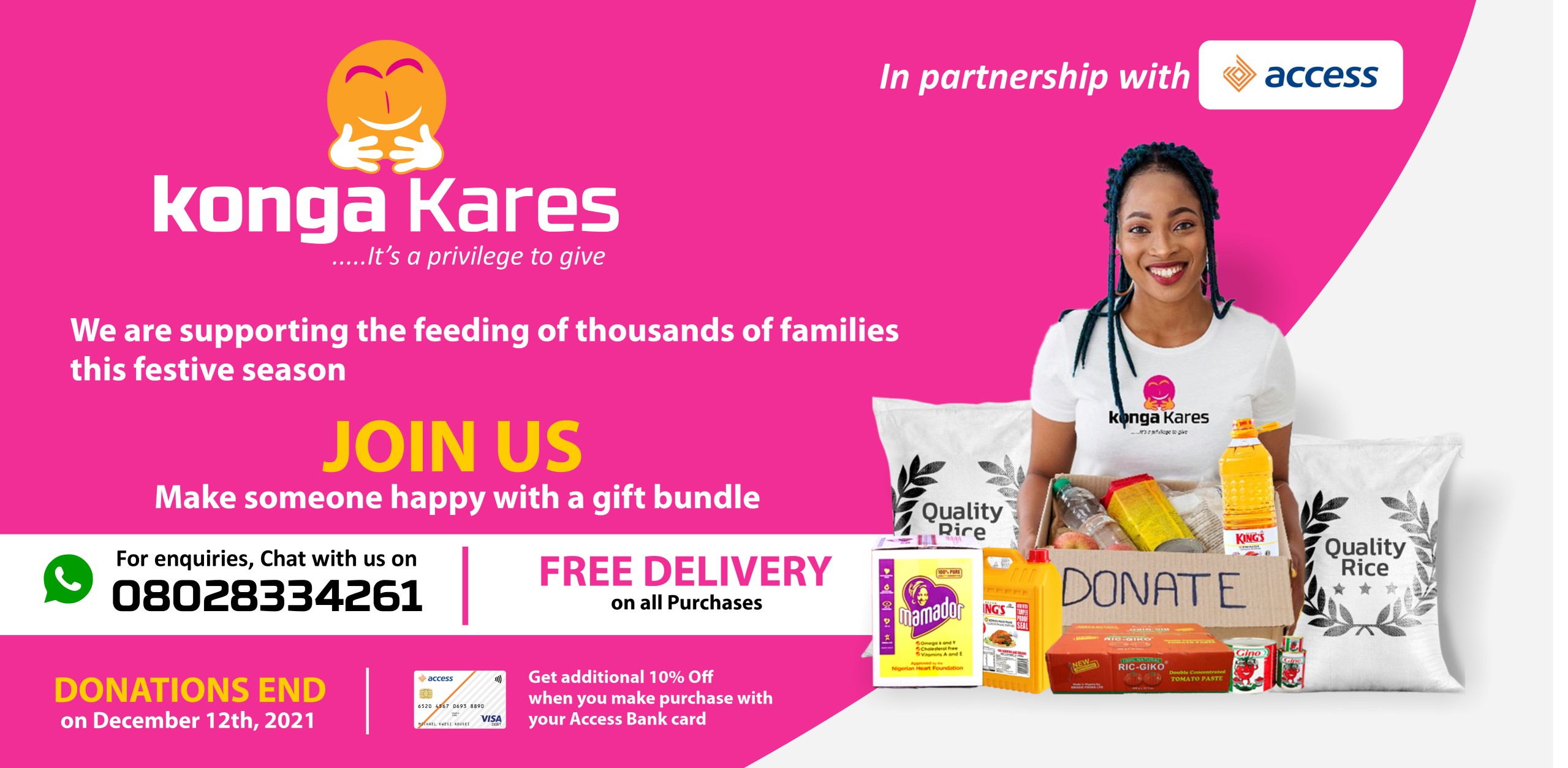 Nigeria’s leading e-commerce giant, Konga and foremost financial institution, Access Bank Plc. have announced plans to support the free delivery of discounted, high quality essential food items to millions of Nigerians in a move targeted at putting smiles on their faces this festive season.