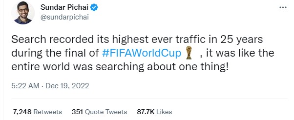 Google said the final FIFA World Cup 2022 match between Argentina and France pushed its search traffic to the highest in 25 years. The CEO of Google and Alphabet Sundar Pichai disclosed this on Monday.