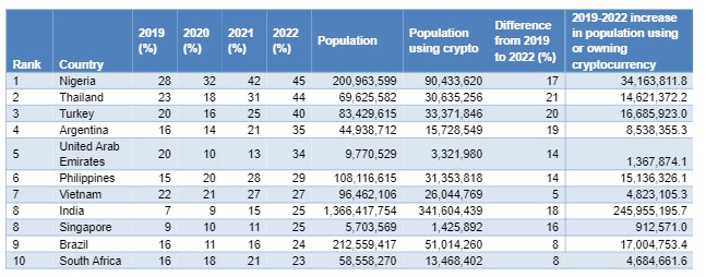 From 2019 to 2022, Nigeria saw a 17% total increase in ownership and use from 28% to 45%, equating to over 34 million people adopting cryptocurrency over the three years.