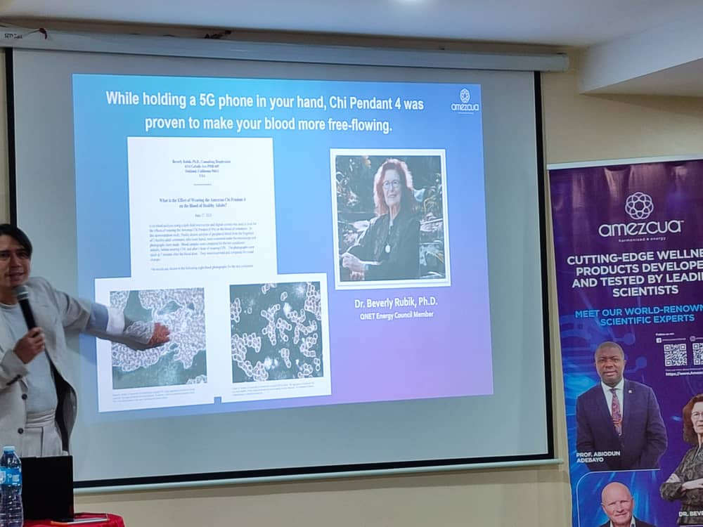 The final product showcased was EGAR-X, a small sticker-type accessory intended for mobile phones and other digital devices. QNET says the product was developed for users who want to reduce their direct exposure to radiation from everyday electronics.
